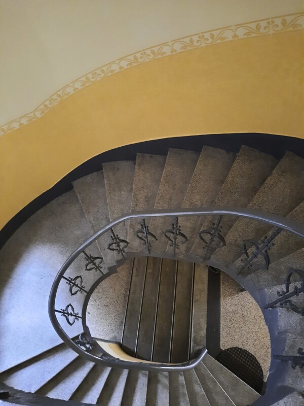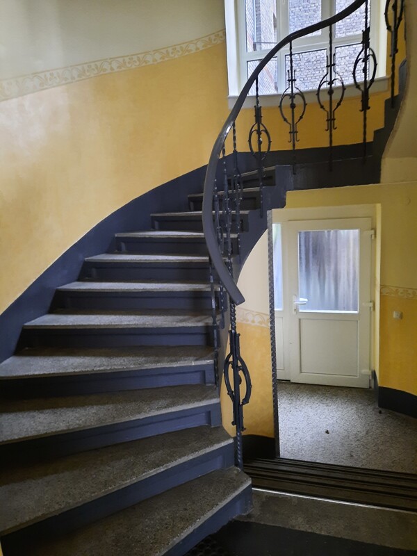 Aufwendig saniertes Treppenhaus mit geschmackvollen Wandaufstrich, Eisengeländer, Marmorböden. (2022)