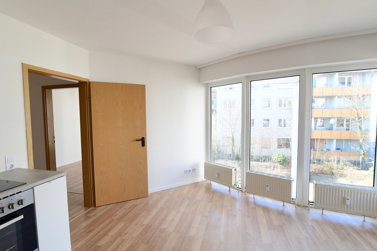 Diese helle und frisch renovierte Zwei-Zimmer-Wohnung befindet sich im 2. Stock eines dreistöckigen Wohngebäudes und ist ab Mai (05.2025) beziehbar. Sie zeichnet sich vor allem durch die großen Fensterfronten in beiden Zimmern aus. Die Wohnung wurde vor kurzem renoviert und mit neuem Laminat-Boden sowie mit einer neuen Einbauküche ausgestattet.