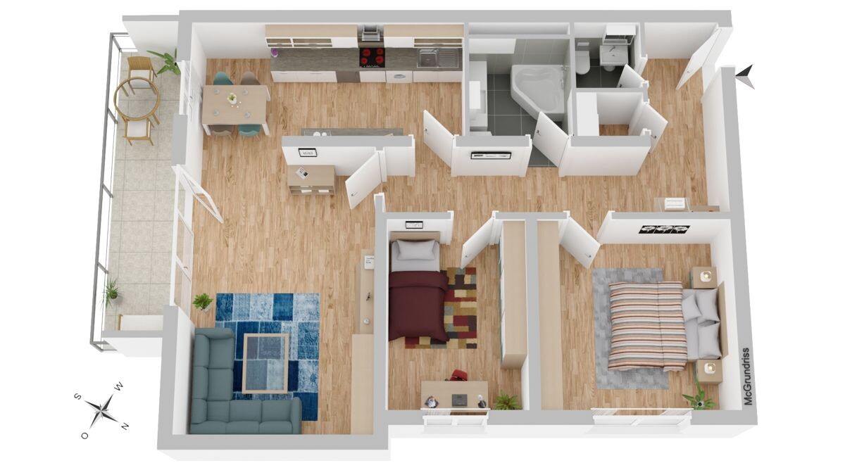 Über den Treppenlift gelangen Sie barrierefrei zum Fahrstuhl, der Sie direkt vor Ihre Wohnung fährt. Im Eingangsbereich der Wohnung finden Sie das Gäste-WC und die Abstellkammer. Über den geräumigen Flur kommen Sie in die beiden Schlafzimmer, in die Küche, das Badezimmer und das Wohnzimmer.
