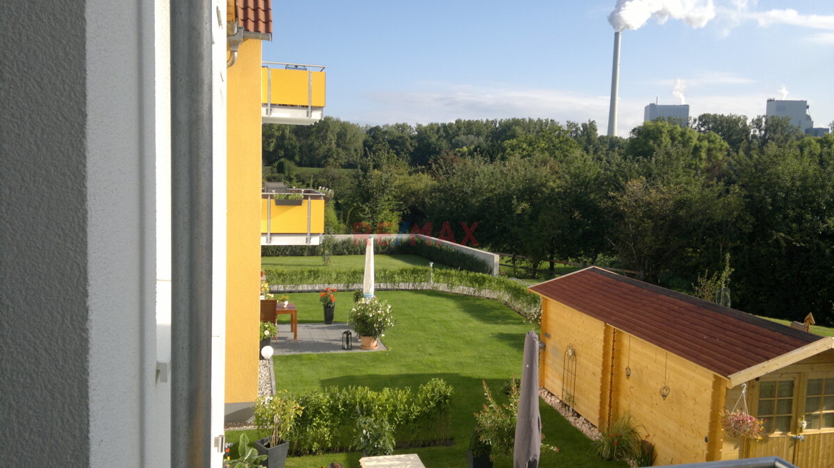 Vom Wohnbereich aus gelangen Sie auf den Balkon, der Platz bietet, die warmen Sommertage im Freien zu verbringen. Hier genießen Sie einen traumhaften Ausblick ins weite Grün, Richtung Altrhein.